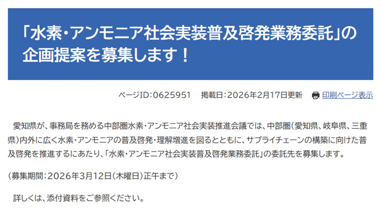 中部圏(愛知県、岐阜県、三重県)内外に広く水素・アンモニアの普及啓発・理解増進を図るとともに、サプライチェーンの構築に向けた普及啓発を推進するにあたり、「水素・アンモニア社会実装普及啓発業務委託」の委託先を募集します。