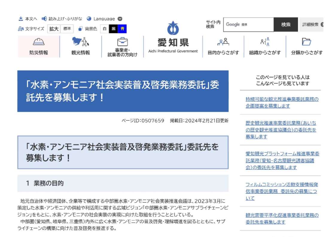 中部圏(愛知県、岐阜県、三重県)内外に広く水素・アンモニアの普及啓発・理解増進を図るとともに、サプライチェーンの構築に向けた普及啓発を推進するにあたり、「水素・アンモニア社会実装普及啓発業務委託」の委託先を募集します。